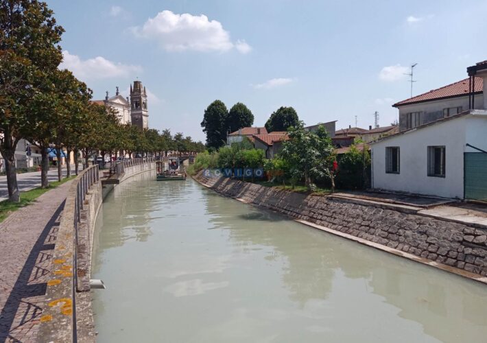 Il Consorzio Adige Po impegnato con una piattaforma galleggiante sul canale in centro al paese. Opere finanziate grazie al Pnrr