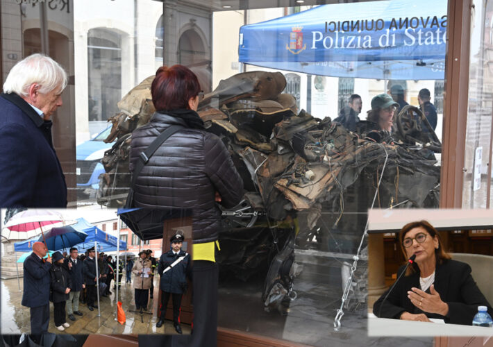 La teca con i resti dell’auto di scorta di Giovanni Falcone esposta in Piazza Garibaldi. Studenti e istituzioni insieme per rinnovare il patto civile contro le...